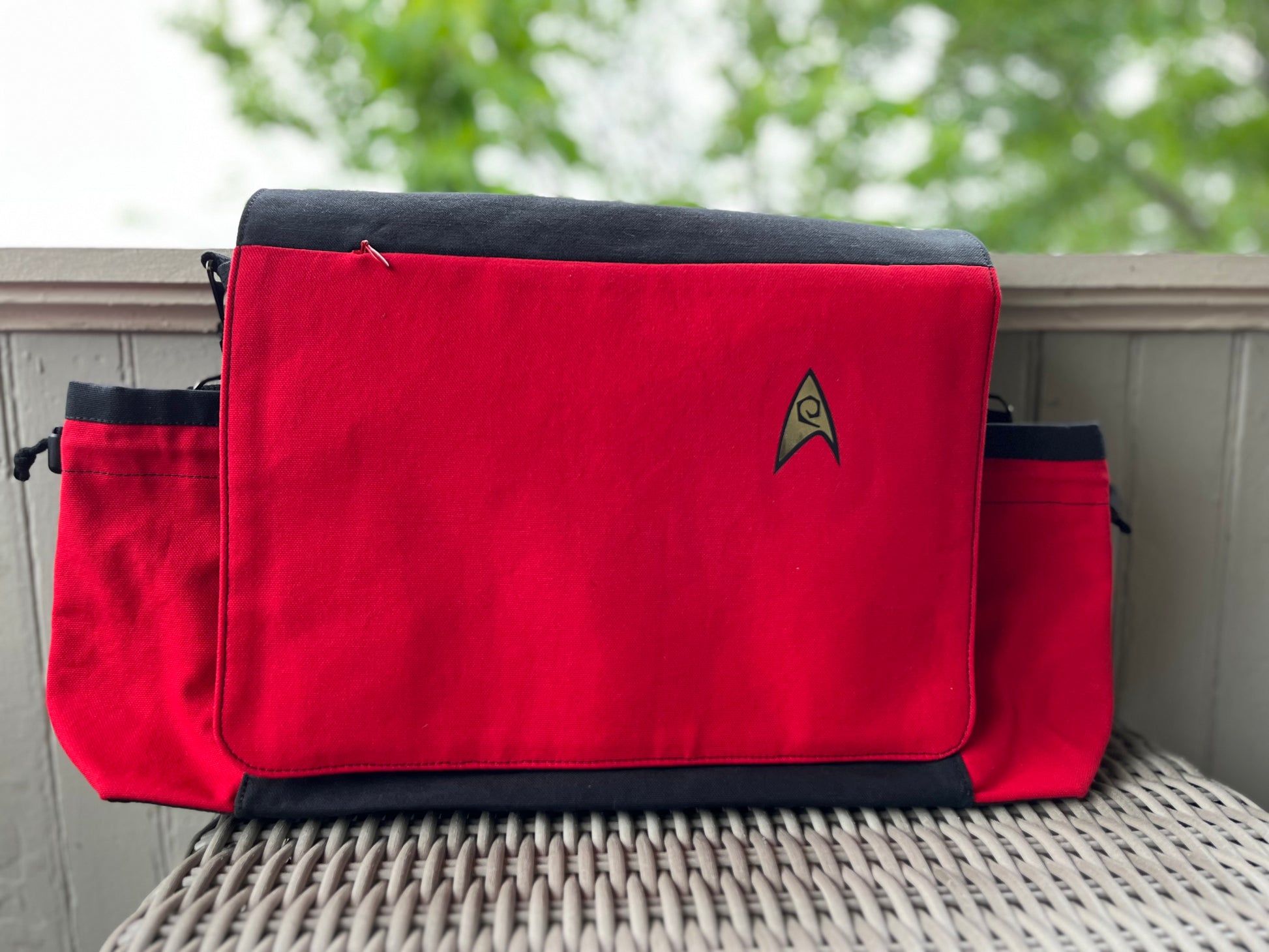 A perfect addition to your cosplay wardrobe, this highly functional bag features two side water bottle pockets, a rear pocket, and multiple internal pockets to keep your scientific equipment organized. Includes an invisible zippered pocket in the flap and open pocket in the rear, a front organizer pocket for your pens, a dual-duty tech pocket for your laptop and tablet, and multiple interior pockets for whatever else you need to carry on your next away mission.