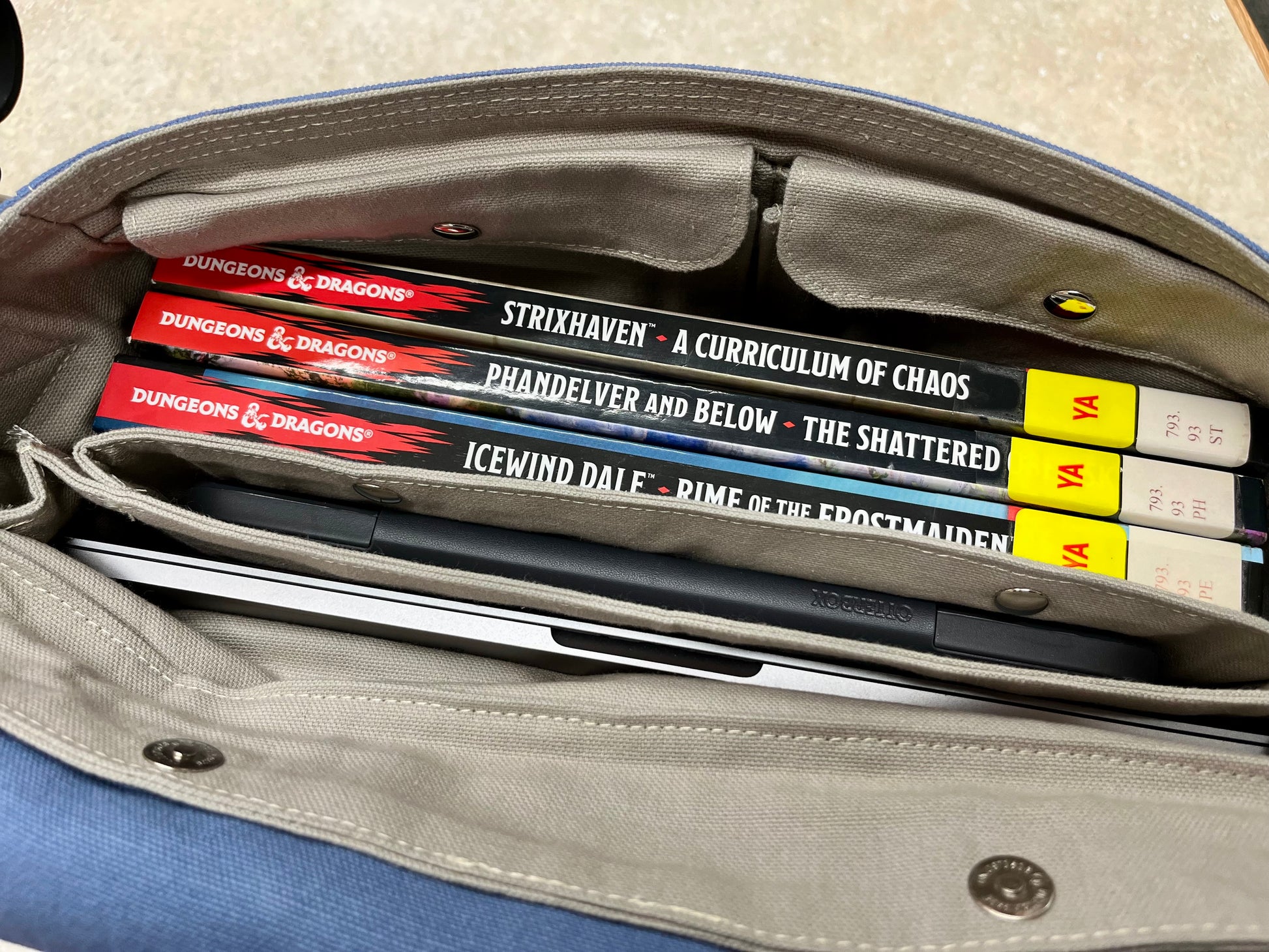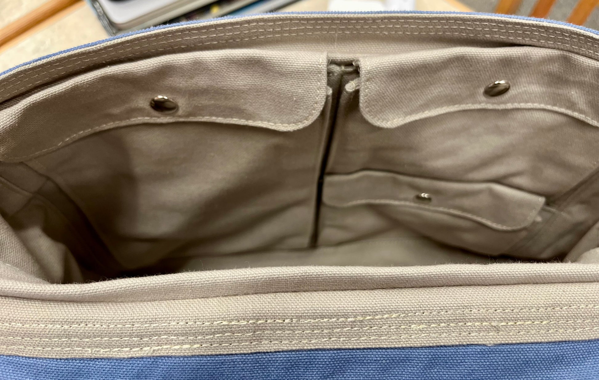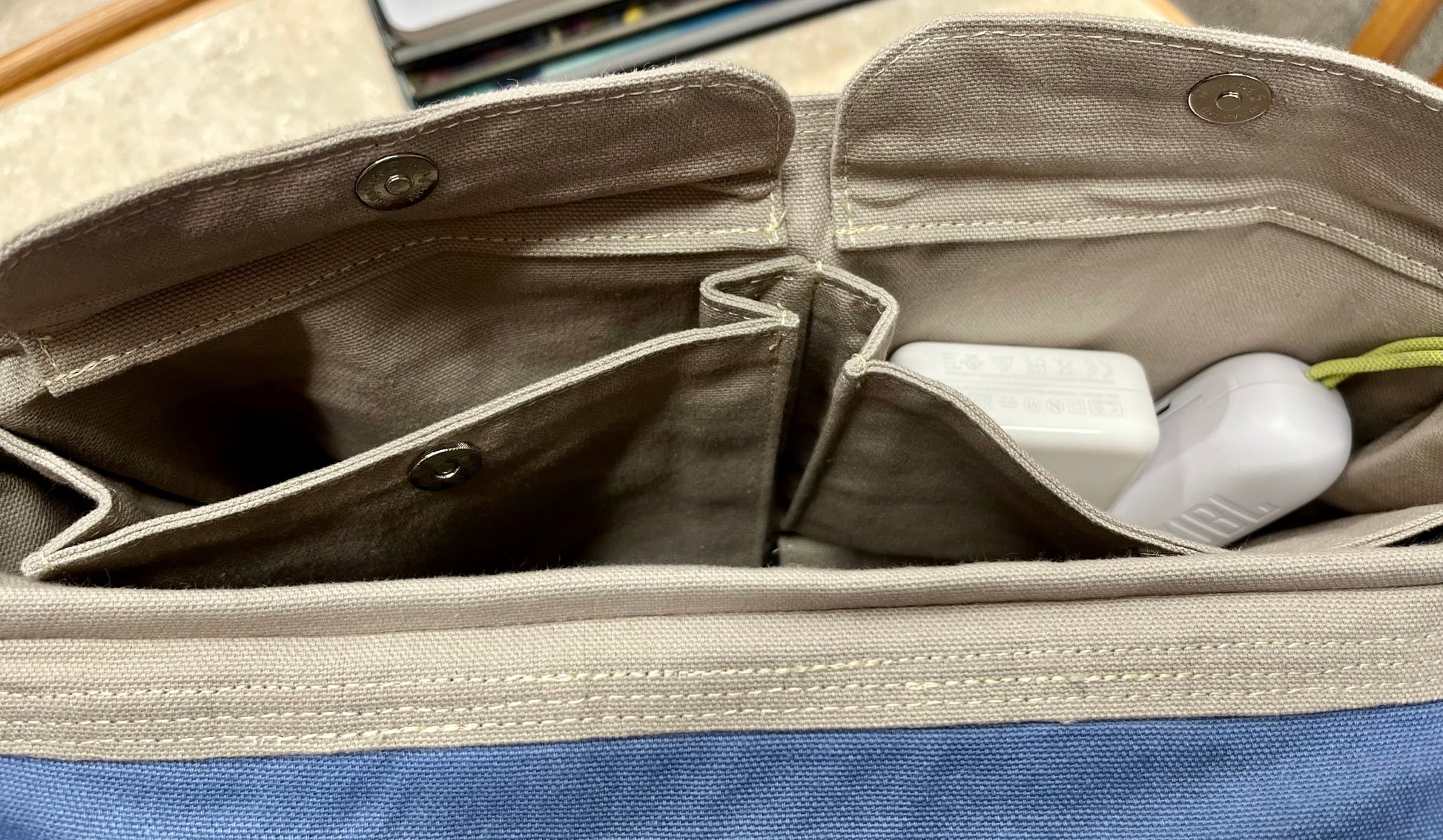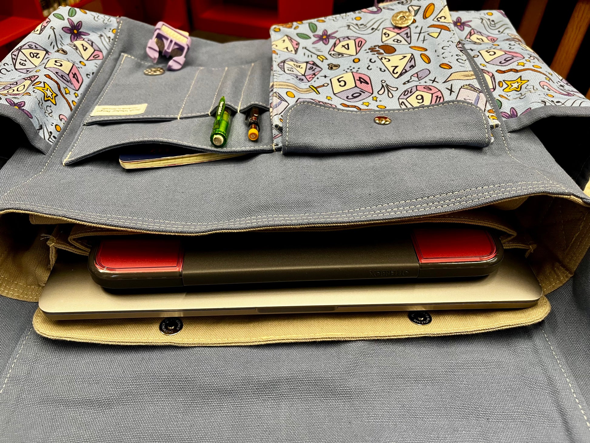 Large messenger bag with dual external cargo pockets, external rear pocket, and flap pocket, as well as dual internal tech pockets and maker's cargo pockets. Made from 100% cotton heavy duty canvas with metal hardware and natural cotton strap.