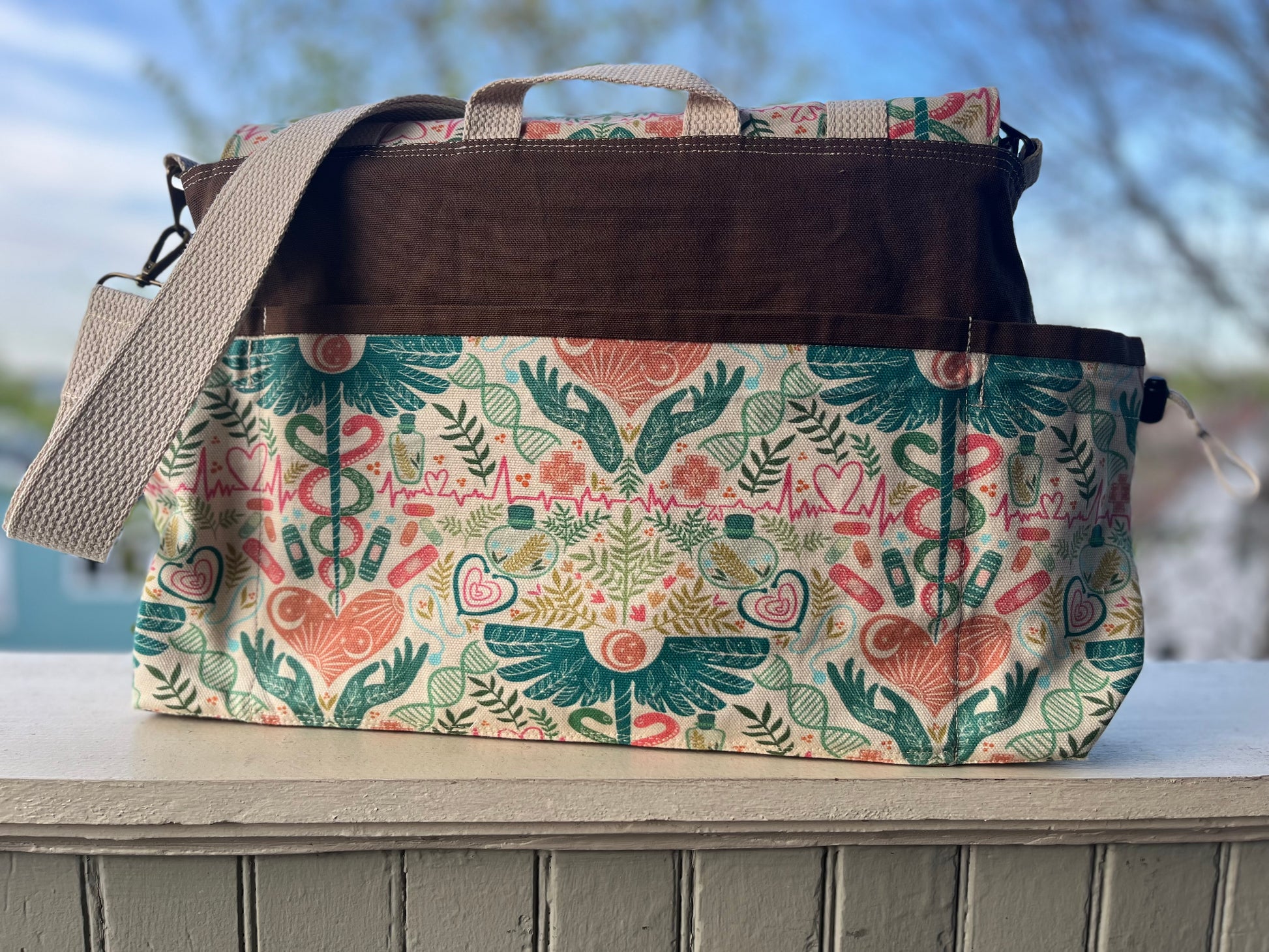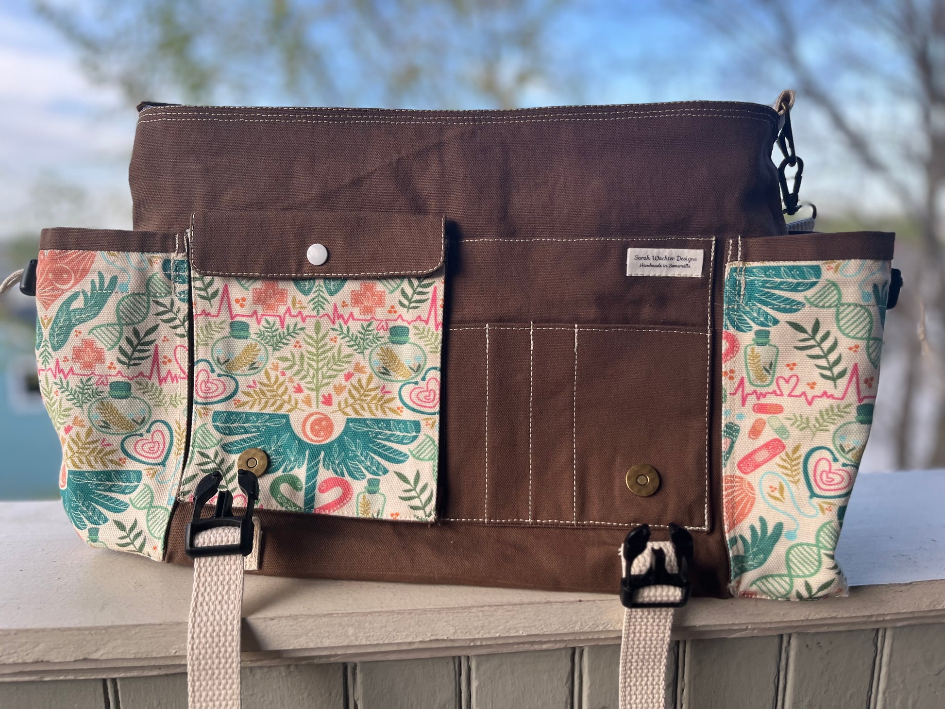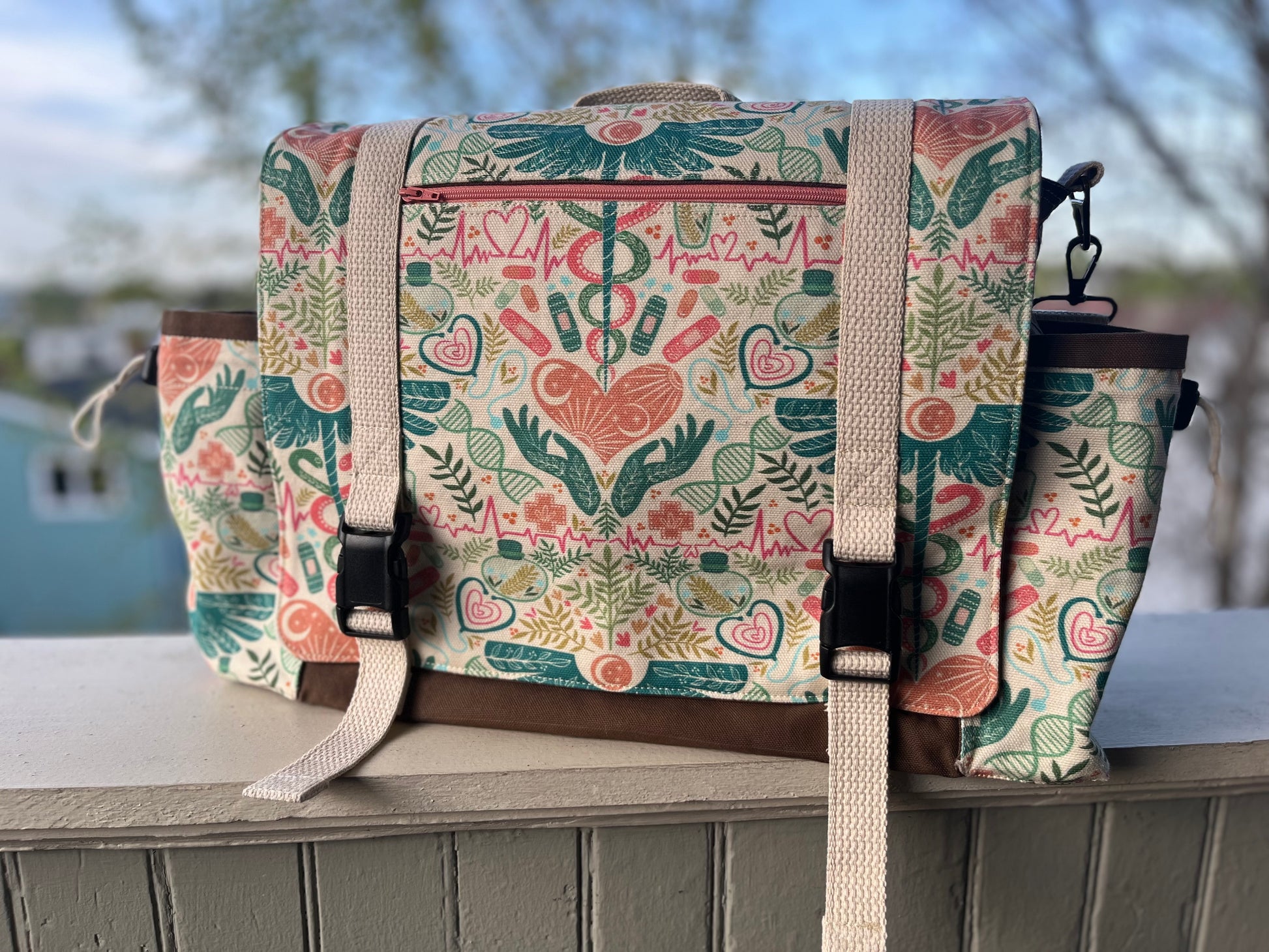 Large messenger bag with dual external cargo pockets, external rear pocket, and flap pocket, as well as dual internal tech pockets and maker's cargo pockets. Made from 100% cotton heavy duty canvas with rainbow hardware and natural cotton strap. Front flap features reflective aurora rhinestones for flashes of insight.