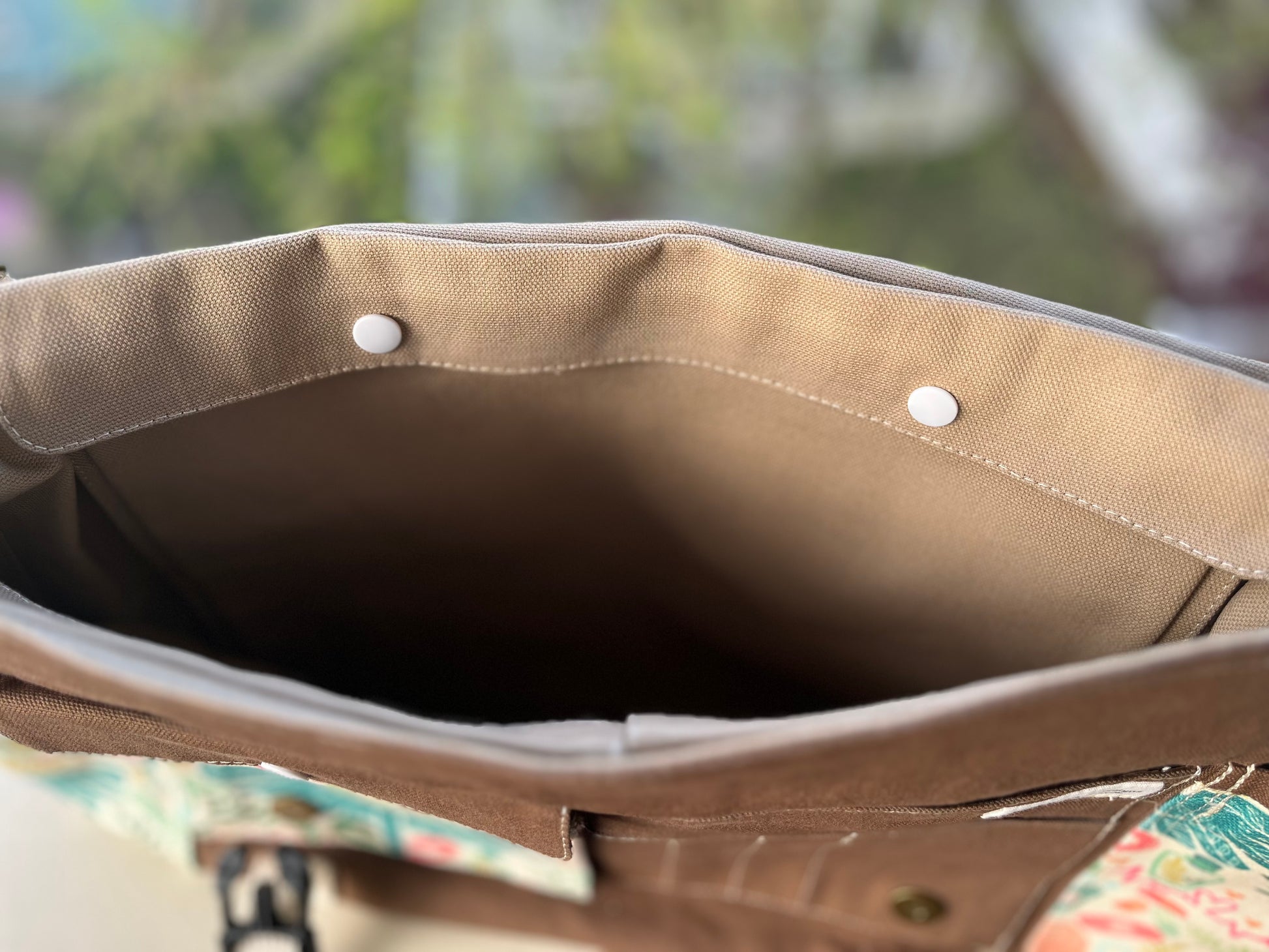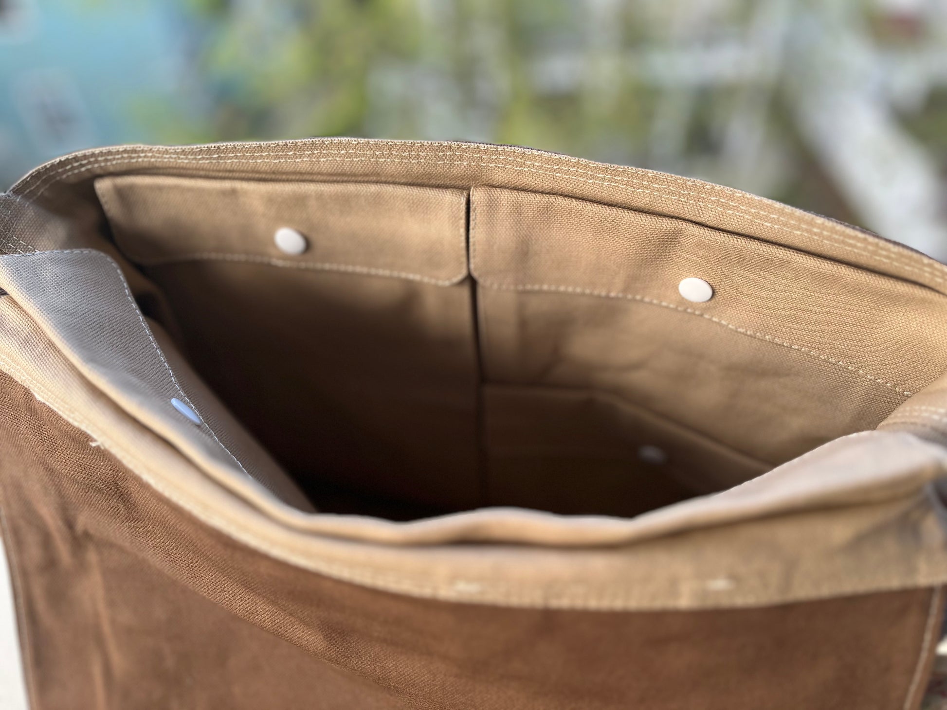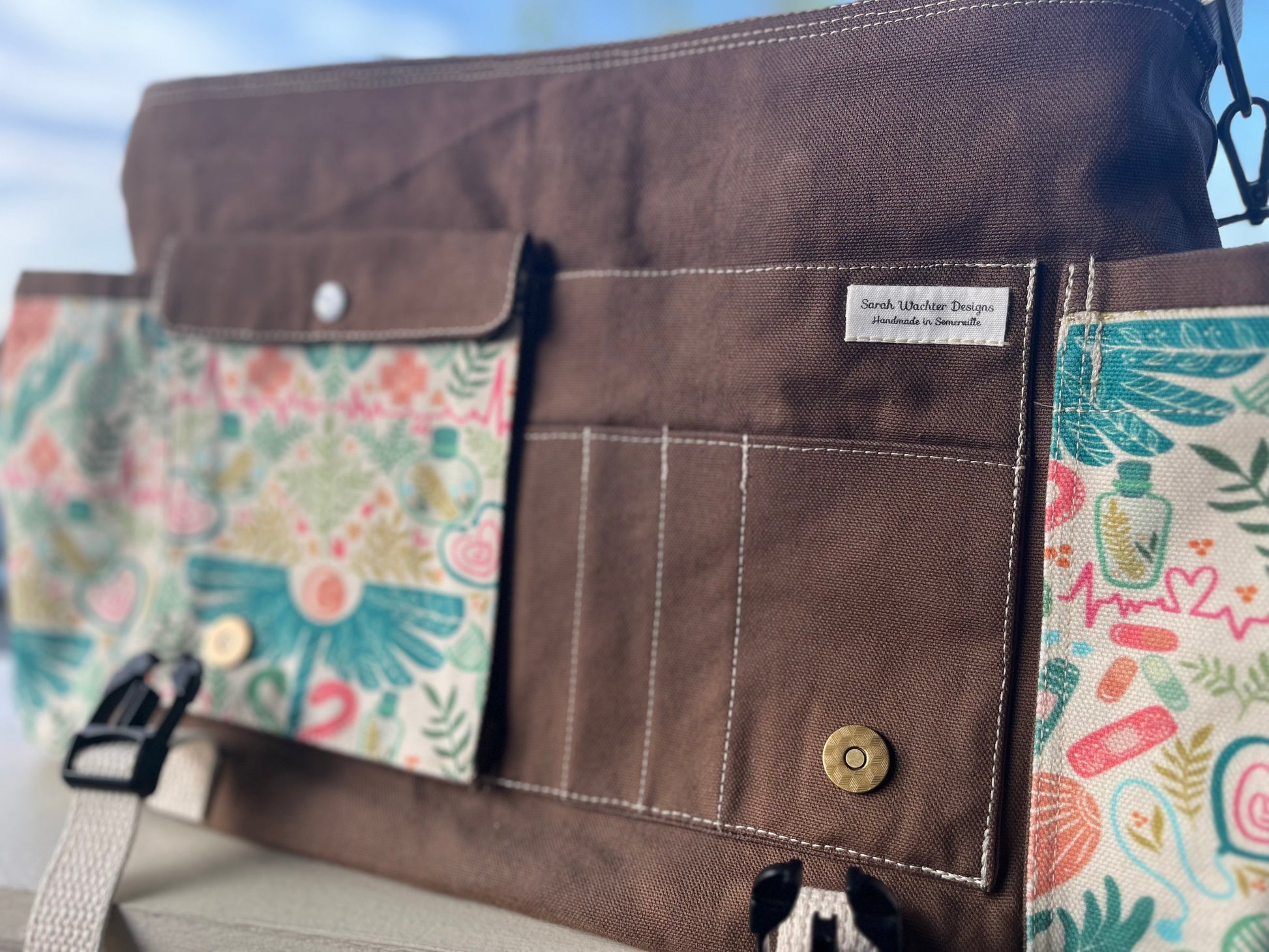 Large messenger bag with dual external cargo pockets, external rear pocket, and flap pocket, as well as dual internal tech pockets and maker's cargo pockets. Made from 100% cotton heavy duty canvas with rainbow hardware and natural cotton strap. Front flap features reflective aurora rhinestones for flashes of insight.