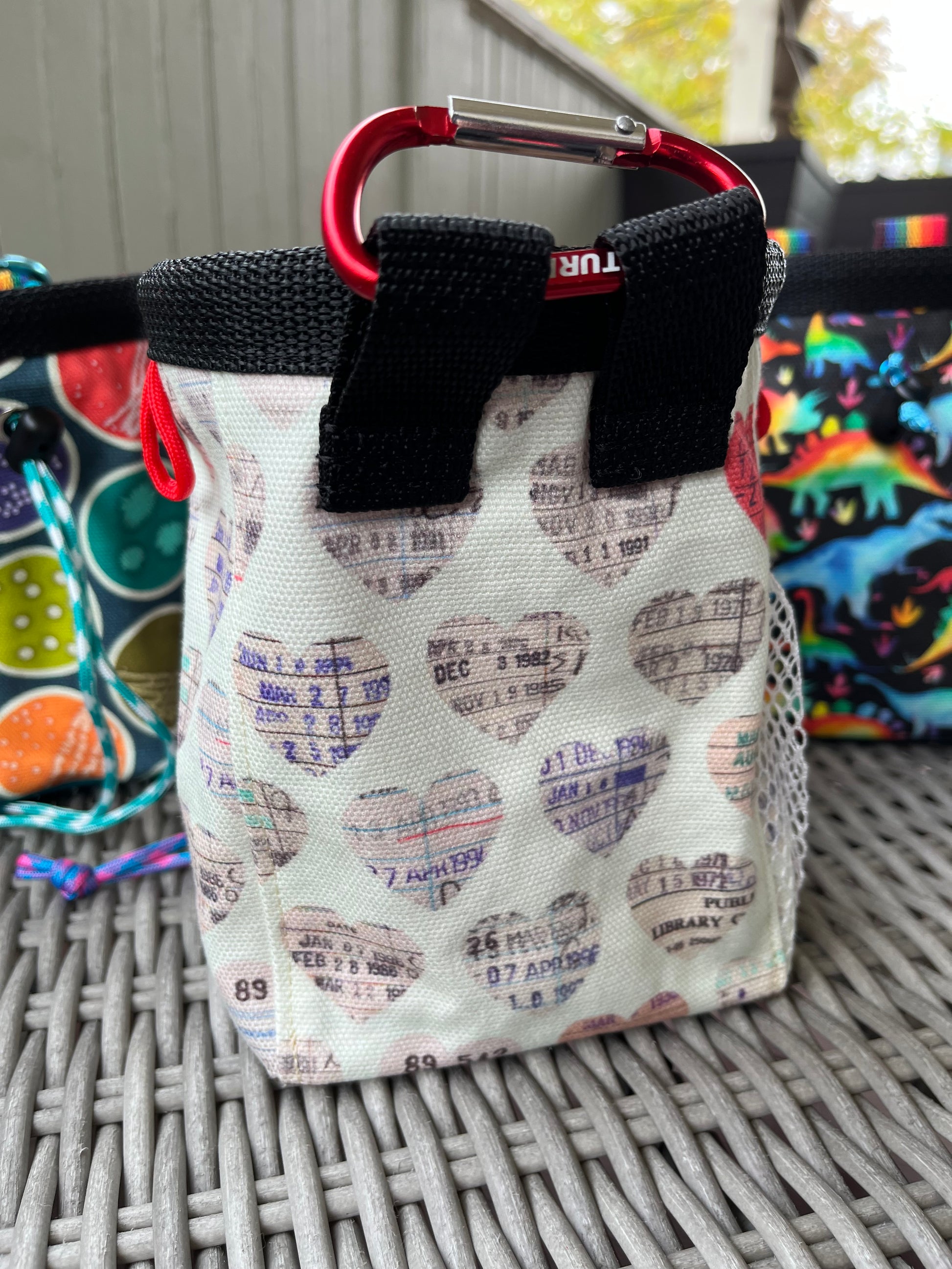 This cotton canvas chalk bag measures approximately 5" wide x 3" deep x 6.5" tall, with a mesh side pocket, drawstring closure, two side loops, and two belt loops and a flannel interior.