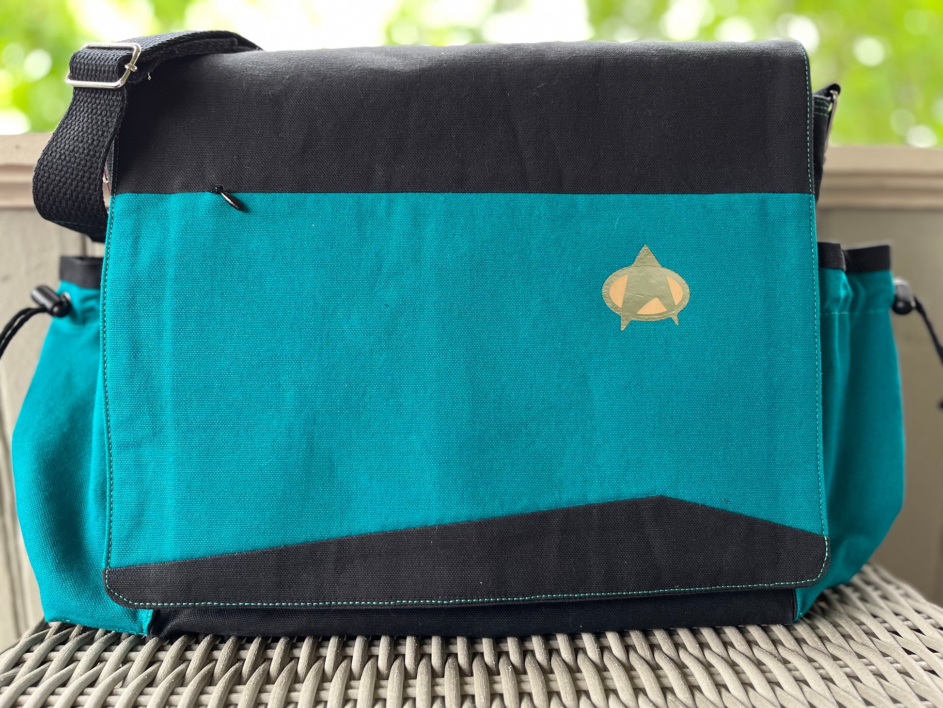 A perfect addition to your cosplay wardrobe, this highly functional bag features two side water bottle pockets, a rear pocket, and multiple internal pockets to keep your scientific equipment organized. Includes an invisible zippered pocket in the flap and open pocket in the rear, a front organizer pocket for your pens, a dual-duty tech pocket for your laptop and tablet, and multiple interior pockets for whatever else you need to carry on your next away mission.