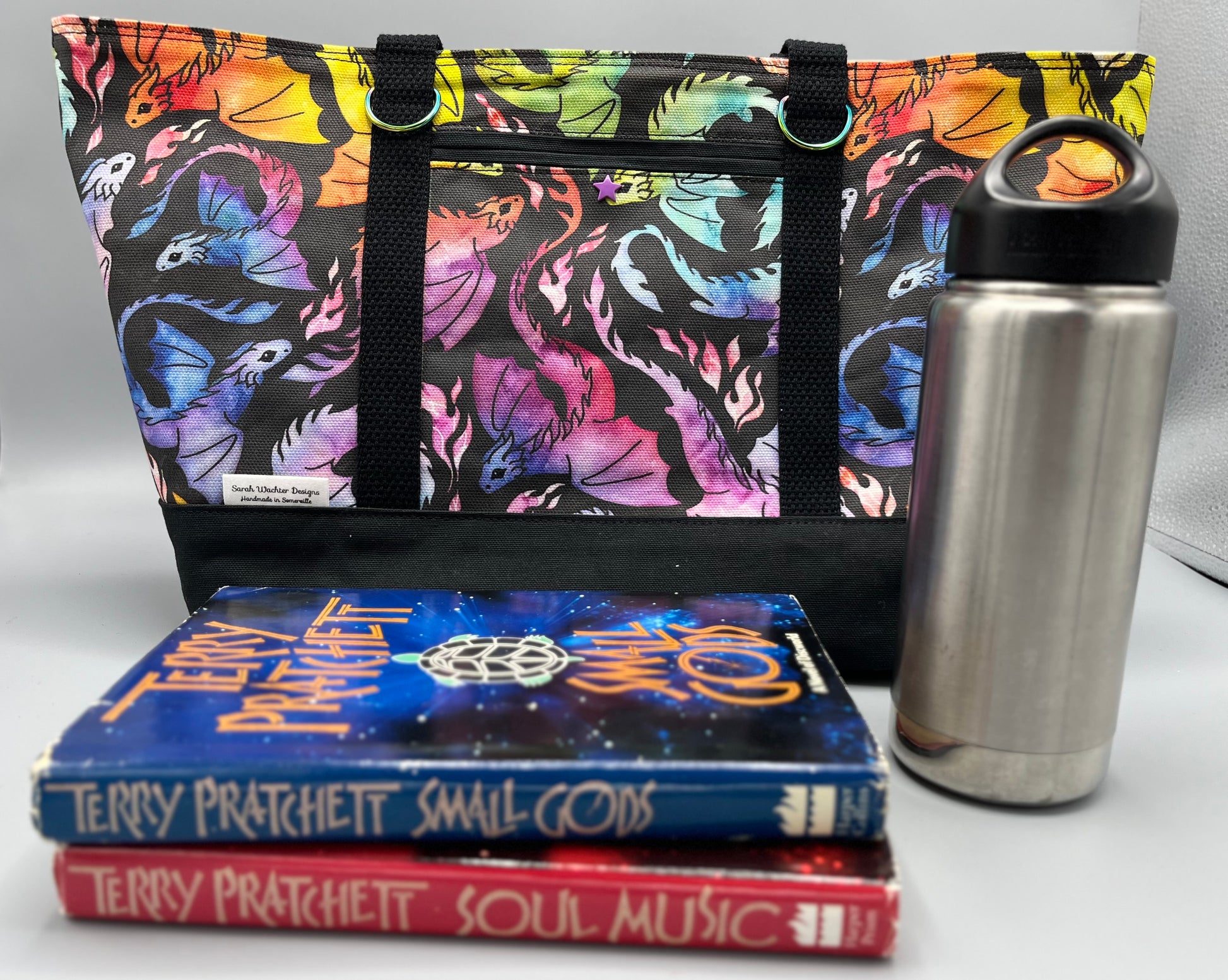 This bag measures approximately 11" high x 13" wide x 6" deep. Fabric design dragon fire dark rainbow by adenaj, printed by Spoonflower on cotton canvas.