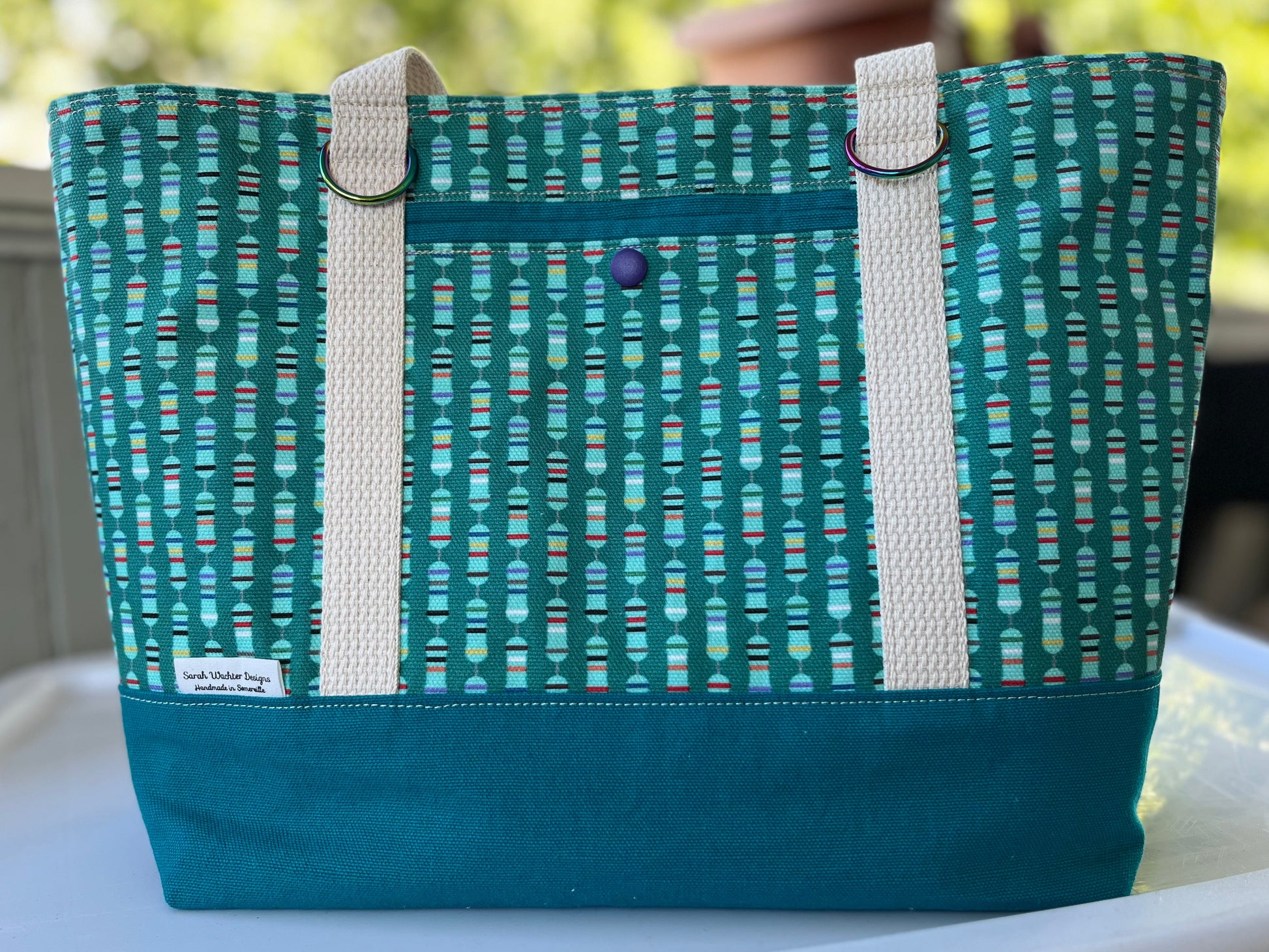 This bag measures approximately 11" high x 12" wide x 5" deep. Fabric design by Elishka Jepson (Etsy), printed by Spoonflower on cotton canvas.